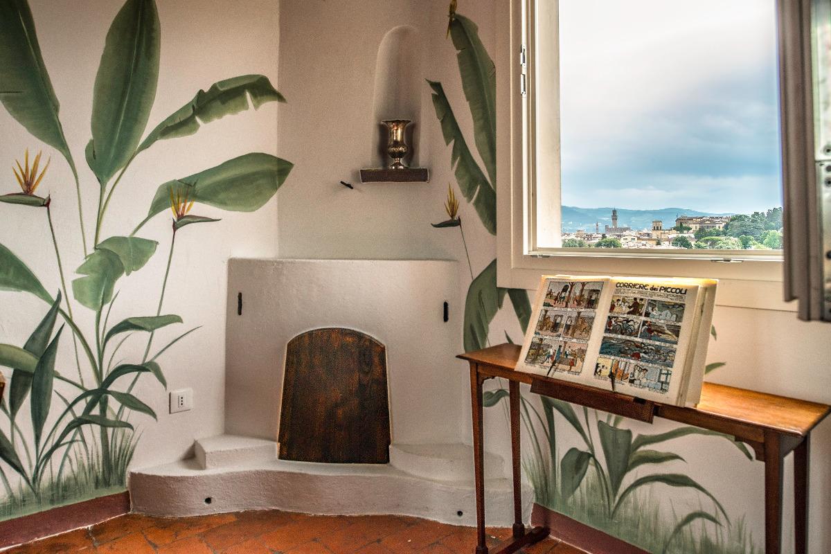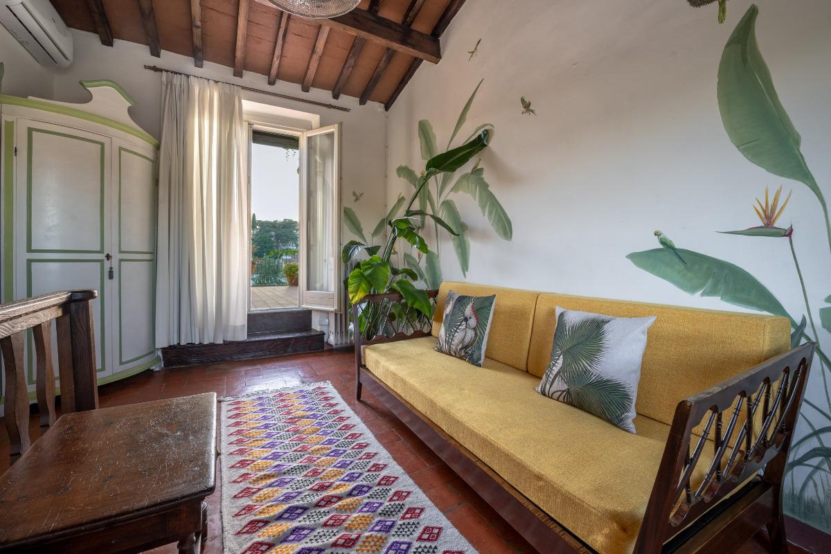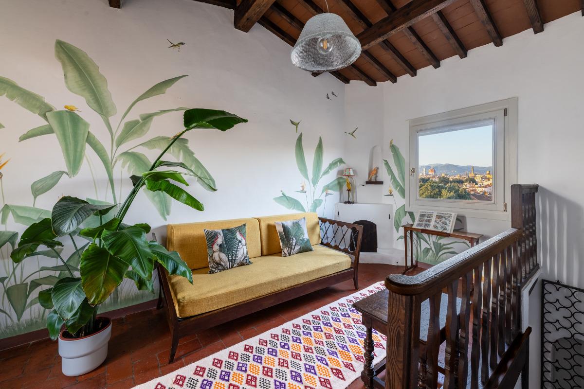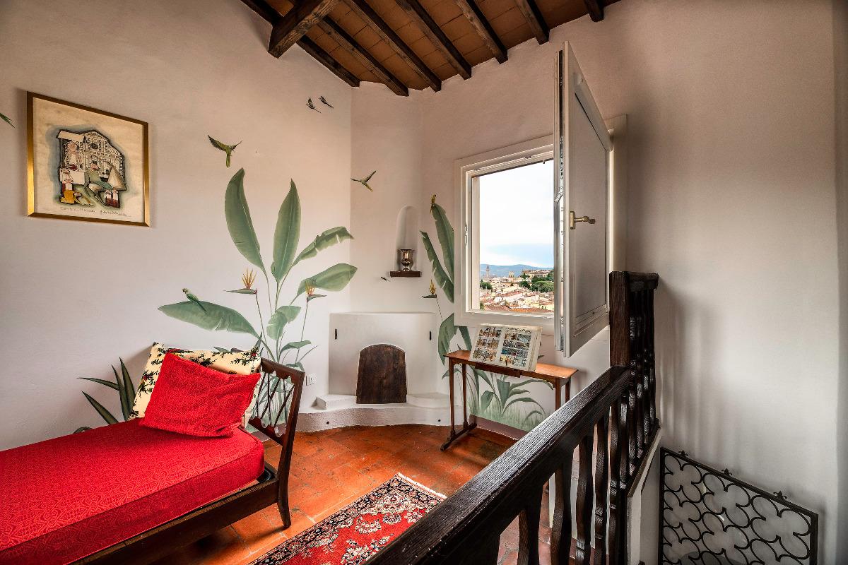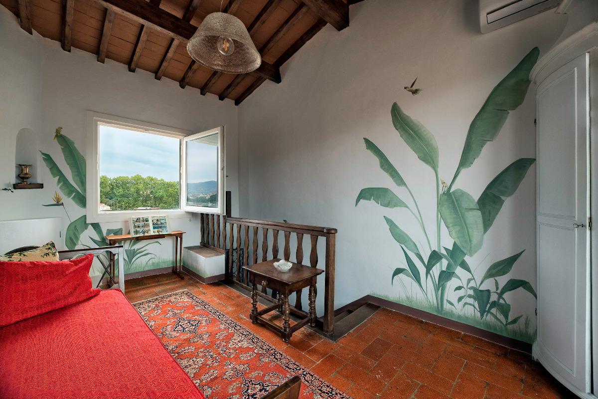 La mansarda, al piano superiore è stata decorata da un’artista fiorentina come se fosse una piccola foresta tropicale e oltre ad ospitare il divano letto, garantisce un divertente angolo di privacy dal resto della casa.