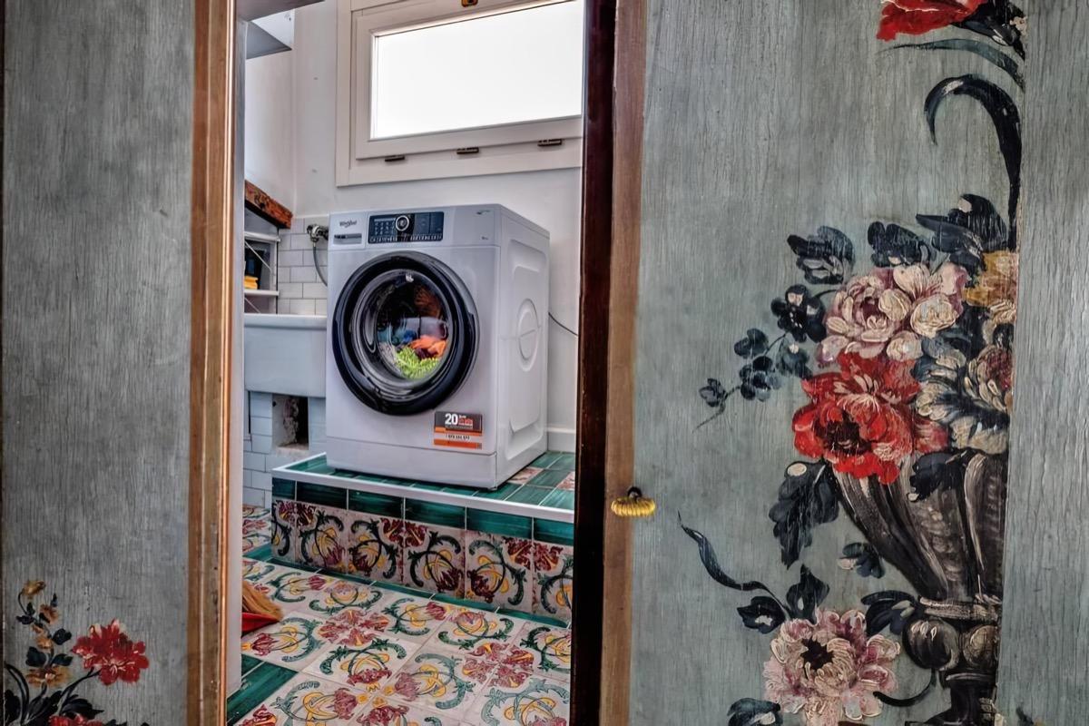 Accanto alla cucina, le ante di un armadio finemente decorato nascondono una piccola lavanderia per il bucato, nel caso fosse necessario.